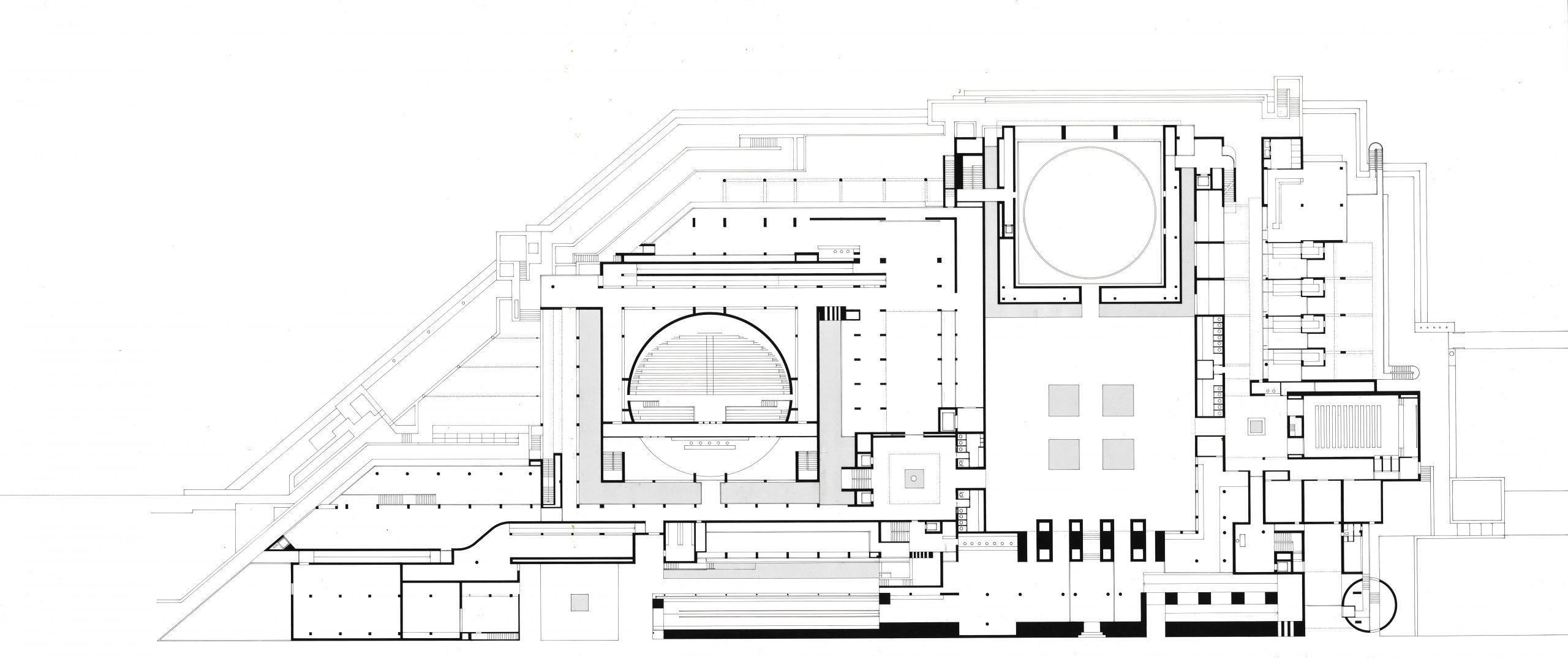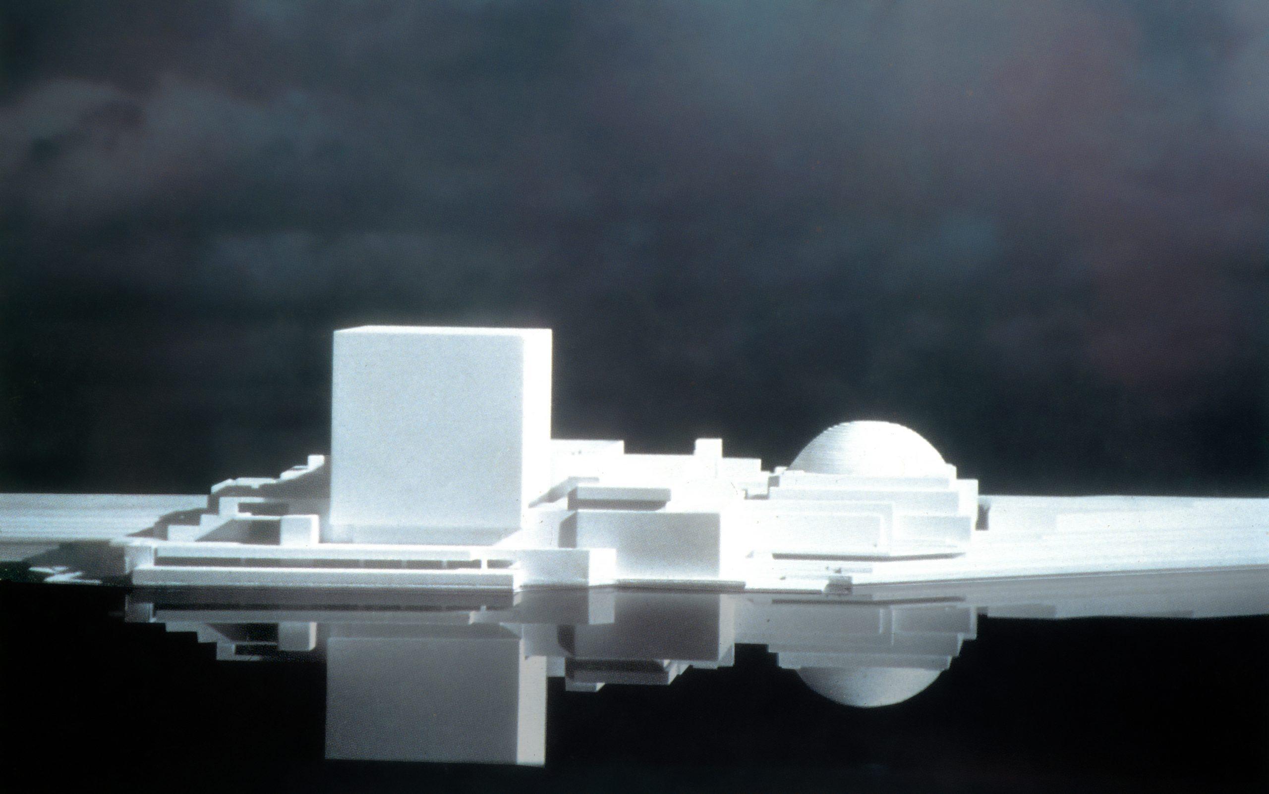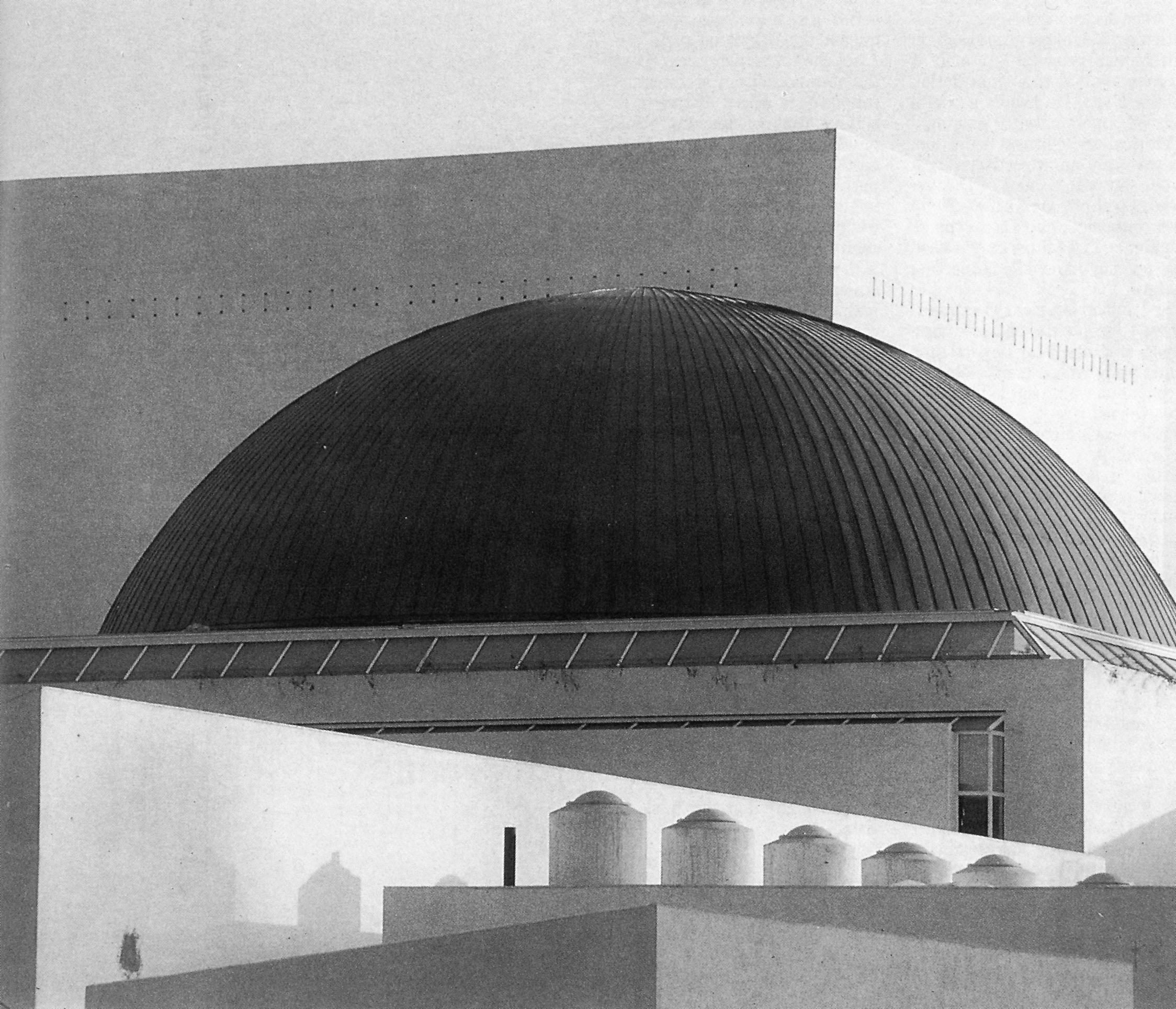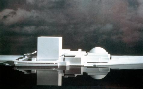 A esto habría que añadir el problema de integrar en el juego de volúmenes la cúpula esférica para proyecciones, exigida por el programa, y que daba un carácter muy marcado al edificio, contrario al la imagen que queríamos. El gran salón de recepciones que avanza sobre el lago, como torre del homenaje o salón del trono de los palacios árabes, equilibró dominando el volumen de la cúpula.