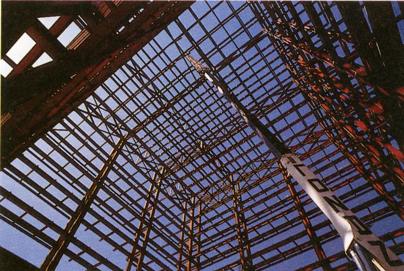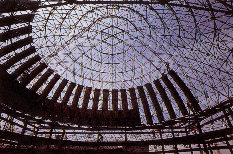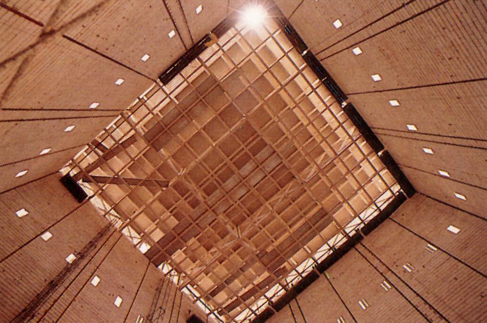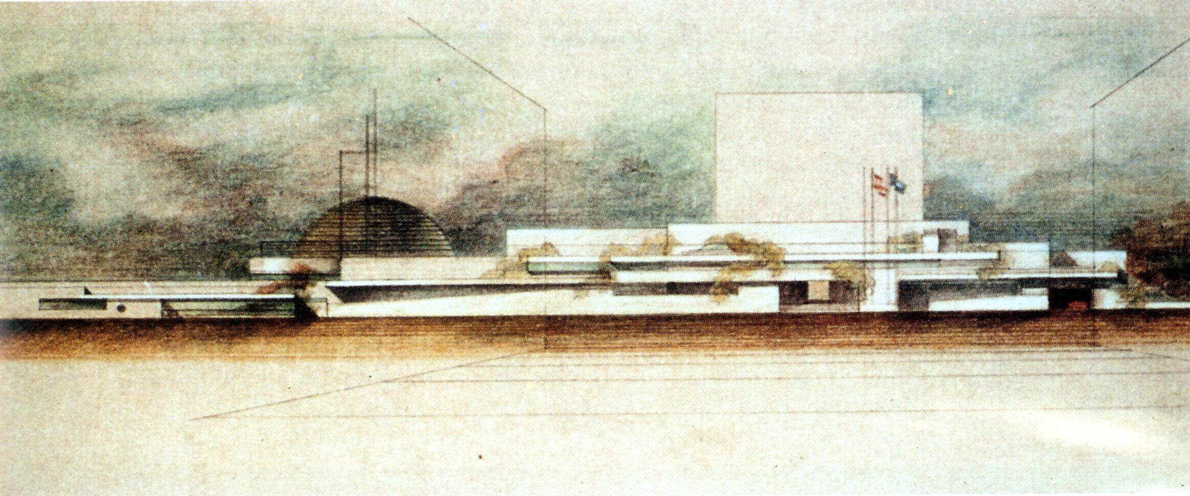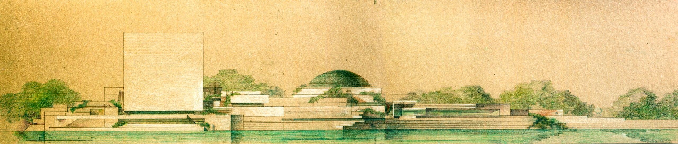 A esto habría que añadir el problema de integrar en el juego de volúmenes la cúpula esférica para proyecciones, exigida por el programa, y que daba un carácter muy marcado al edificio, contrario al la imagen que queríamos. El gran salón de recepciones que avanza sobre el lago, como torre del homenaje o salón del trono de los palacios árabes, equilibró dominando el volumen de la cúpula.